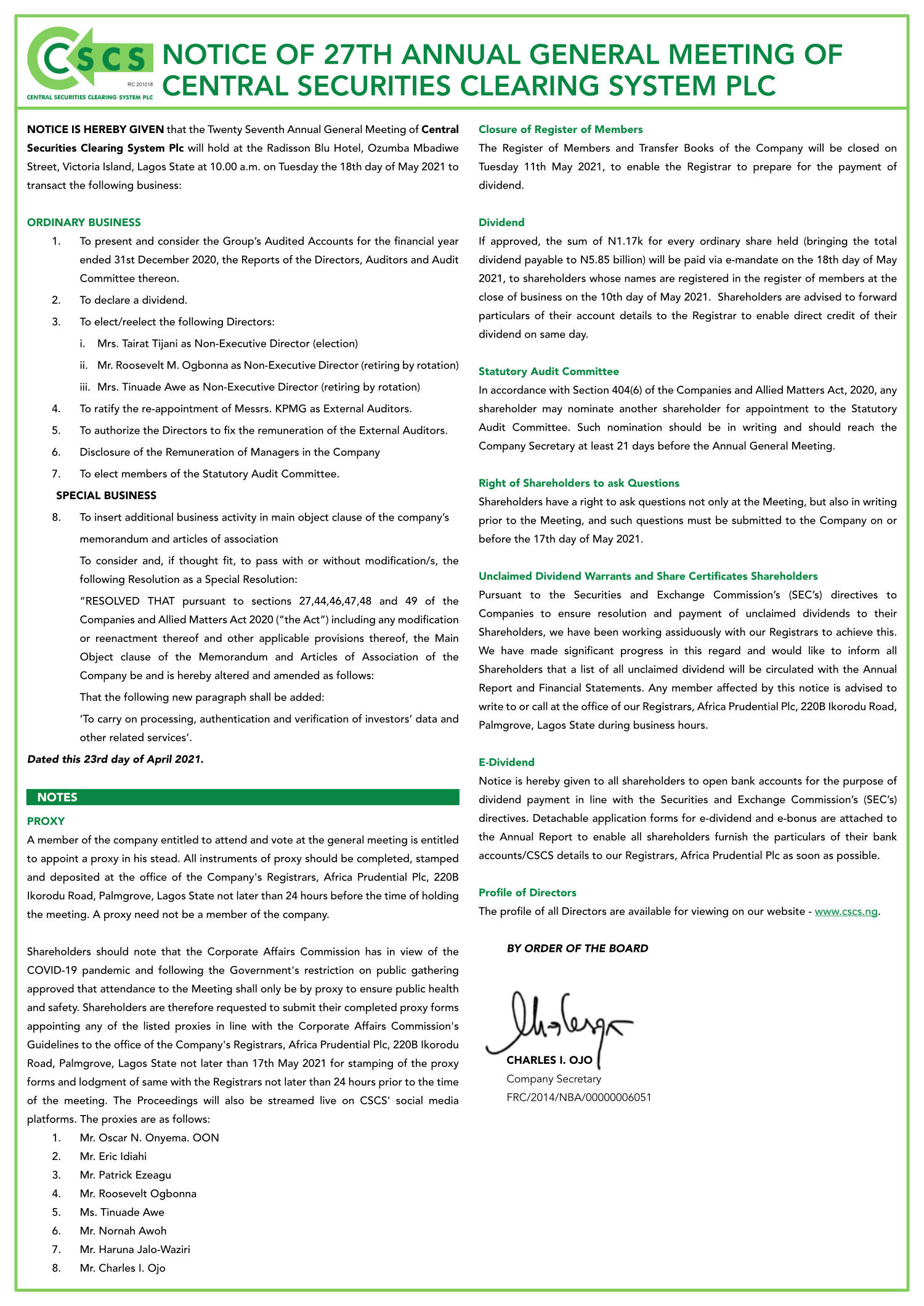 Notice of 27th Annual General Meeting of Central Securities Clearing System PLC
